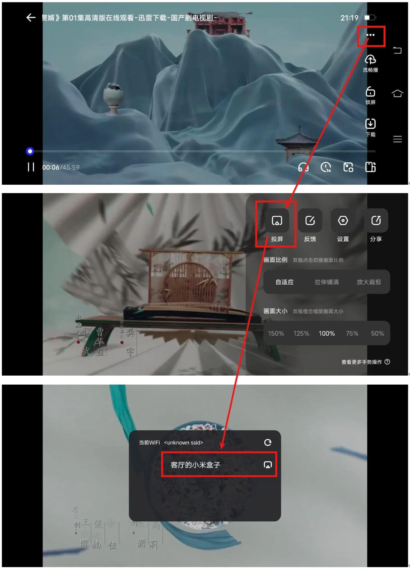 打开安卓UC浏览器->打开轻影->开始播放->全屏->左下角投屏->等待搜寻到智能电视/电视盒子->选中,即可投屏。