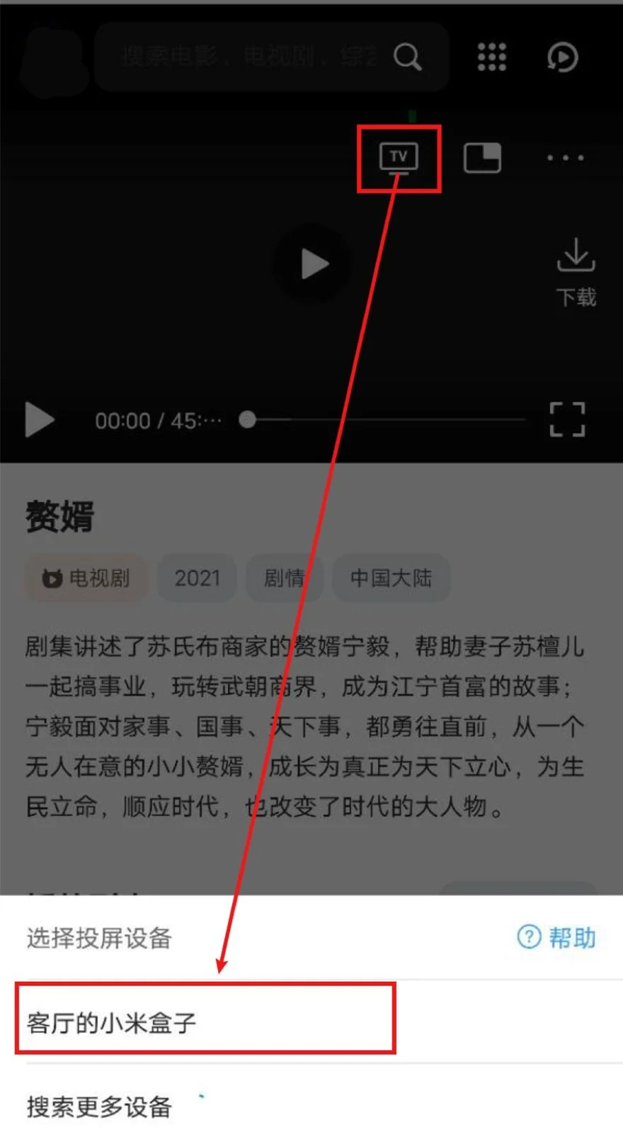 打开QQ浏览器(会接管网页播放器)->打开轻影->播放视频->选中投屏图标->等待搜寻出智能电视/电视盒子->选中,即可投屏。
